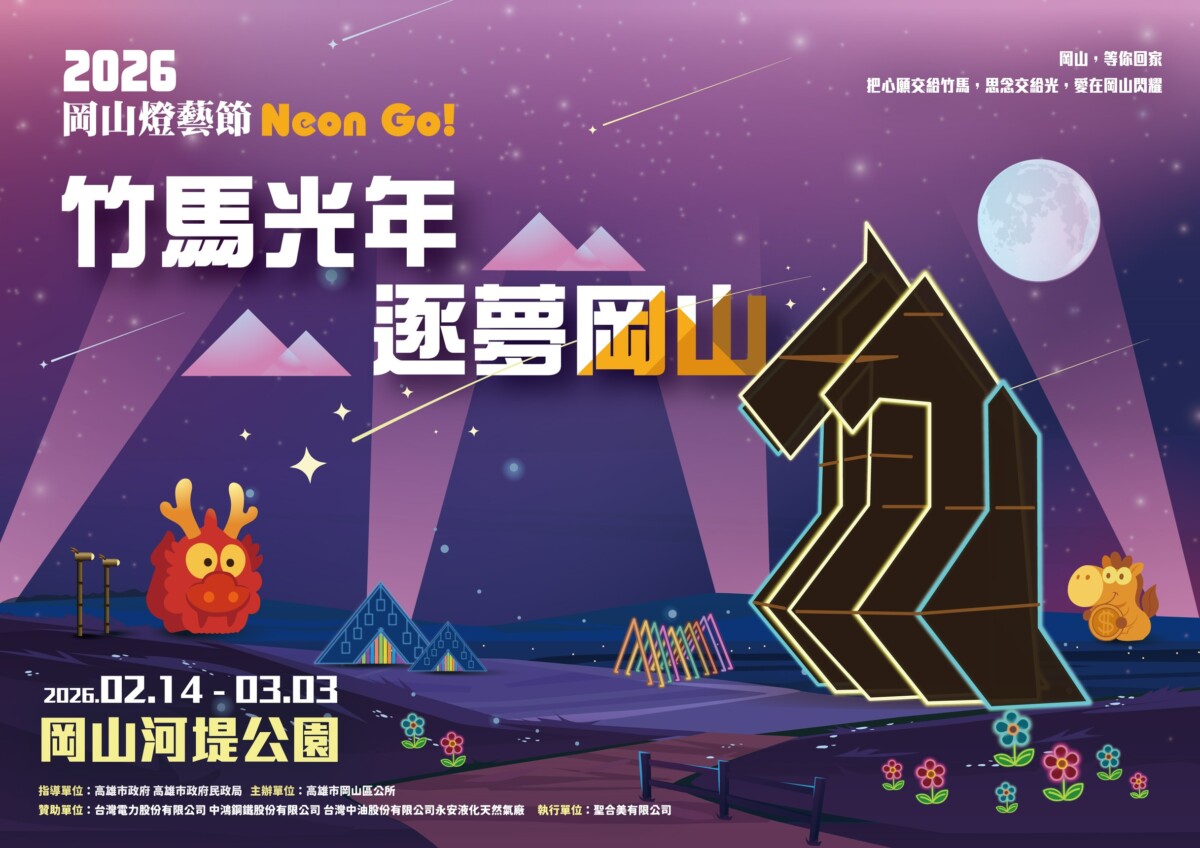 【記者 王苡蘋╱高雄 報導】2026年岡山燈藝節以「竹馬光年.逐夢岡山」為主題,於2月14日至3月3日在岡山河堤公園、阿公店橋及筧橋盛大展出,結合燈光裝置、光影藝術與在地文化,打造具藝術性與互動性的夜間觀賞體驗。