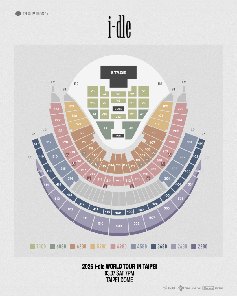 《2026 i-dle WORLD TOUR [Syncopation] IN TAIPEI》門票分為 VIP 區 7,180元、7,100元、6,880元、6,280元、5,980元、4,980元、4,580元、3,680元、2,480元、2,280元。門票以三階段開賣,i-dle Berriz OFFICIAL FANCLUB NEVERLAND 會員可於 1 月