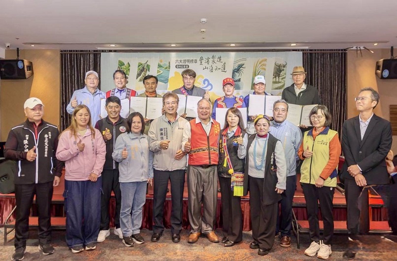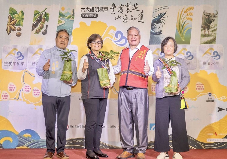 與會貴賓包括原住民族委員會副主任委員陳義信、農業部農村發展及水土保持署花蓮分署長鐘啟榮、行政院農業委員會農糧署東區分署科長陳冠瑋、農業部林業及自然保育署花蓮分署秘書余蘭君、農業部農田水利署花蓮管理處專門委員黎碧宏、花蓮縣政府原住民行政處副處長徐采瑤、花蓮縣政府中區服務中心副主任莊秀妹、花蓮縣議會議員笛布斯·顗賚、議員周駿宥、議員蔡依靜、秘書劉宋彬、議員李正文助理張小明、議員林正福助理陳忠祥、豐濱鄉民代表會主席司玉花、代表吳耀福、代表李威寰、工業技術研究院經理黃盈賓、鄉鎮諮詢委員林進福、翁基峯、黃榮輝、洪清一、馬中原,以及各村村長與各部落事務組長等人到場,共同見證豐濱鄉六大證明標章正式發布。(照片花蓮縣原民扶助協會提供)