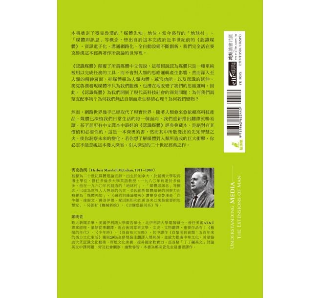 然而,網路世界幾乎已經取代了現實世界,隨著人類愈來愈依賴高科技產品,媒體已深植我們日常生活的每一個面向,我們重新推出翻譯流暢易讀,甚至是所有中文譯本中最好的《認識媒體》,麥克魯漢這本由已逝名譯家鄭明萱老師所翻譯的經典代表作,是絕對有其價值和必要性的。這是一本深奧的書,然而其中所散發出的先知智慧之火,使你洞察未來的變化。若你想了解媒體對人類所造成的巨大衝擊,你必定不能忽視這本發人深省、引人深思的二十世紀經典之作。