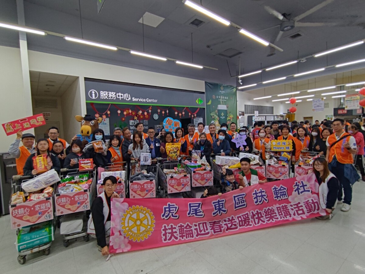 【記者 劉春生/雲林 報導】歡喜「馬」上購、幸福「馬」Happy,虎尾東區扶輪社連續12年舉辦「社區扶輪日:HappyGo 迎春送暖快樂購」活動,由王慶樟社長率領超過40位社友及寶眷,陪伴雲林家扶30戶親子、每戶3000元在家樂福虎尾店幸福大採購。雲林家扶社工更變身「吉祥馬」陪伴採買,讓家庭在輕鬆、安心的氛圍中備齊所需物資,感受社會的支持與祝福,為新的一年注入希望與力量。