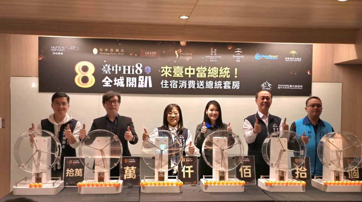 【記者 廖美雅/台中 報導】台中市政府觀光旅遊局推出「來台中當總統—住宿消費送總統套房」系列抽獎活動,第二場薆悅酒店總統套房住宿券抽獎今(18)日由觀光局、立法院江啟臣副院長服務處代表及薆悅酒店五權館代表抽出2名獲獎幸運兒。觀旅局長陳美秀表示,這次活動透過總統套房抽獎機制,串聯台中市優質旅宿資源,不僅鼓勵旅客延長停留時間,也吸引更多民眾實際走進台中,深度體驗城市多元且豐富的觀光魅力。