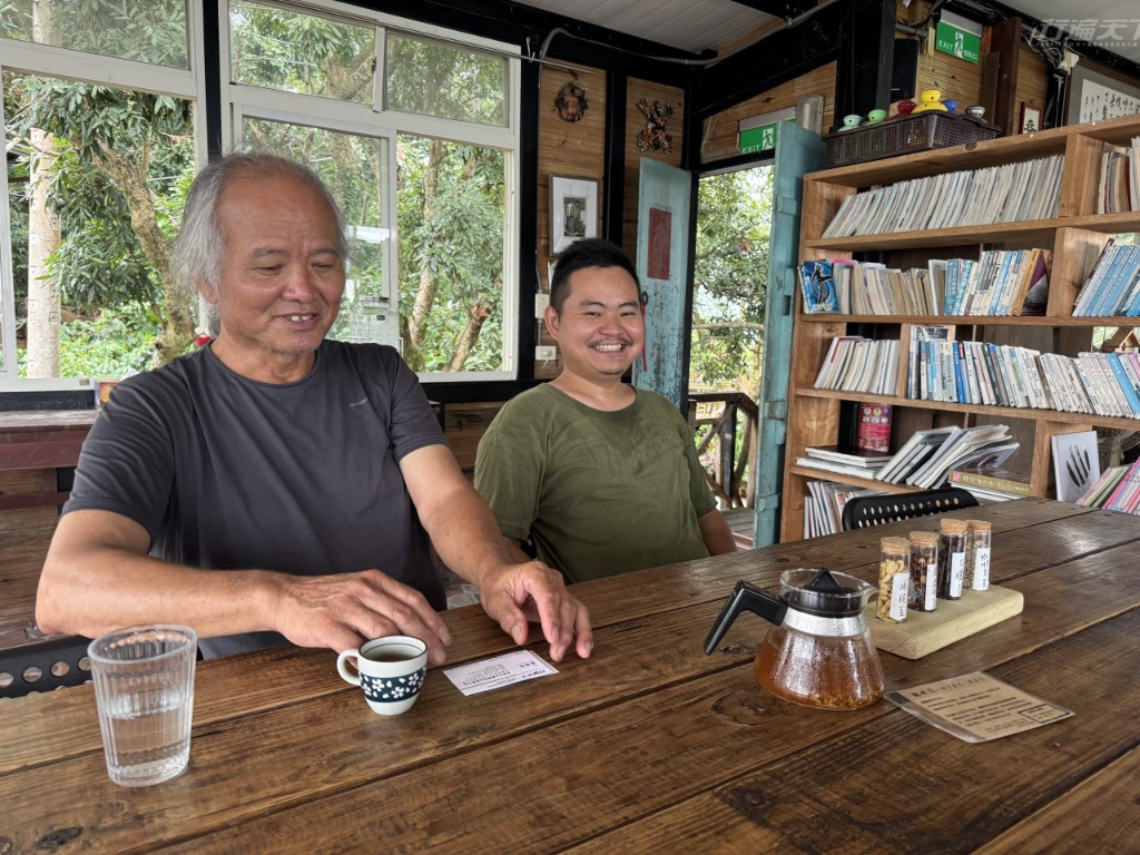 ▲ 郭雅聰與兒子笑談大鋤花間的開拓故事。