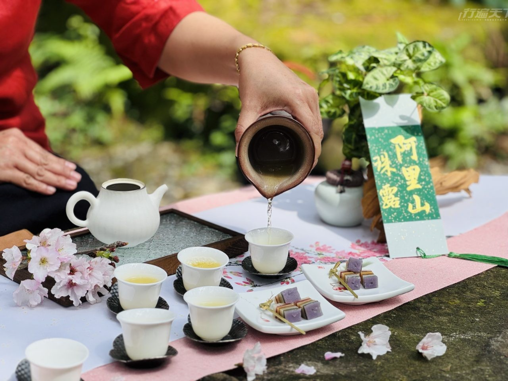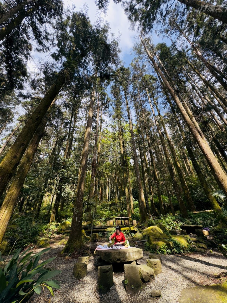 在這片海拔約1,600公尺的森林中,看似隨意散落的巨石,成為最天然的茶桌,只要提前預約,來自阿里山石棹茶文化協會的茶藝師,便會帶著自家栽製的高山茶與點心,走入森林鋪設茶席,讓品茶的旅人,在茶香、霧氣與芬多精交織的氛圍中,放慢呼吸感受一場沉澱身心的品茶儀式,也體會阿里山茶文化的美學與意境。