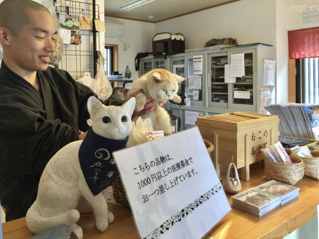 ▲ 寺內的年輕僧人抱著レオ君,笑容燦爛地感謝每一份支持。櫃台上的「貓咪募金箱」,匯聚了來自四面八方的愛心。
