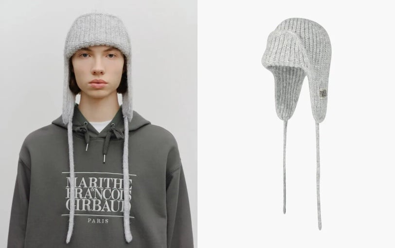 MARITHÉ+FRANÇOIS GIRBAUD 經典 Logo 護耳毛帽是很多韓妞冬季首選!淺灰色編織溫柔有質感,正面小小的品牌織標點綴就超有記憶點。它的護耳片做得比較俐落,戴起來不會把臉型壓扁,搭配帽T、羽絨外套或長大衣都很合理,還能用綁帶調整鬆緊,保暖度跟造型感一次到位。