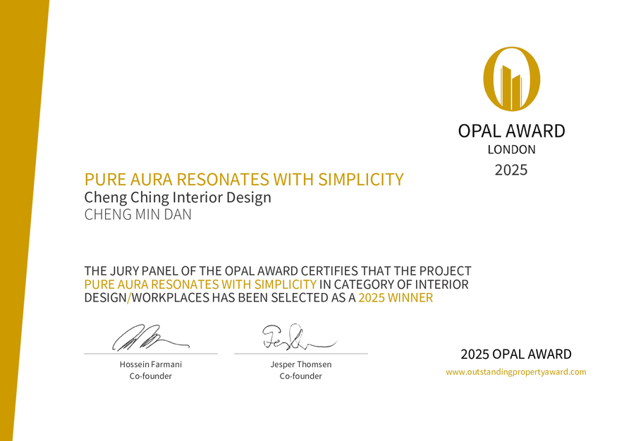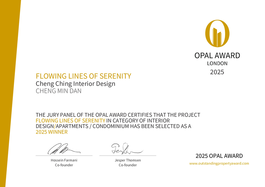 OUTSTANDING PROPERTY AWARD LONDON,OPAL(英國倫敦傑出地產大獎)由全球知名企業集團Farmani Group組織,並以招攬全球最佳建築師、室內設計師與房地產開發商為目標,在創造異業菁英聯合平臺的同時,找尋各地最富創造力、革新感、社會影響力與永續性的設計方案。本屆賽事中,澄境設計 設計總監