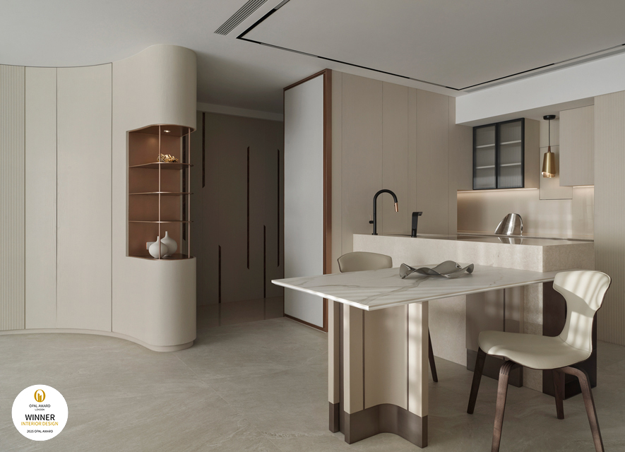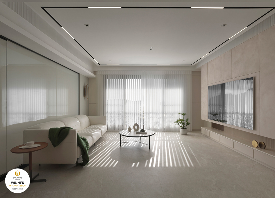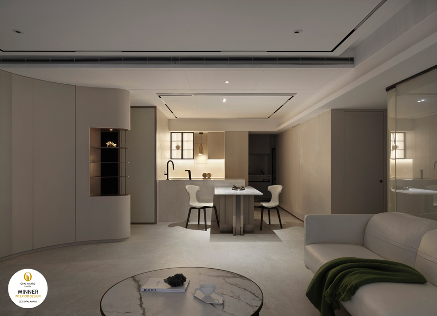 鄭抿丹 帶來家宅《弧光柔藝》與商業空間《淨光敘簡》雙作參賽,前者透過寬縫片簾捕捉自然光影,使其在水泥灰地坪上隨時序流轉,整體米色基調搭配簡約線板勾勒出溫暖舒心的氛圍;後者則以大地色藝術漆與柔和弧形背牆,化解冷硬石材的距離感,並運用靈活玻璃隔間兼顧開放性與隱私需求。兩案皆深刻體現大賽所倡導的「創造力」核心理念,於國際設計舞臺上展現精湛實力,雙雙獲得「Winner」佳績!