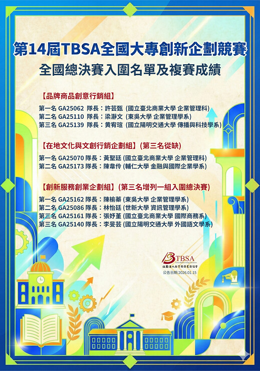 【記者 沁諠/台北 報導】由社團法人台灣商務策劃協會(TBSA)主辦的「第 14 屆 TBSA 全國大專創新企劃競賽」,1月15日正式公布全國總決賽入圍名單。本屆競賽吸引全台大專院校高度關注,共有近 200 支隊伍,近千名師生報名參賽,經過初賽與複賽的嚴格篩選,最終僅有 9 支菁英隊伍脫穎而出,晉級率低於 5%,展現了國內大專學子在商業企劃領域的高水準競爭力 。
