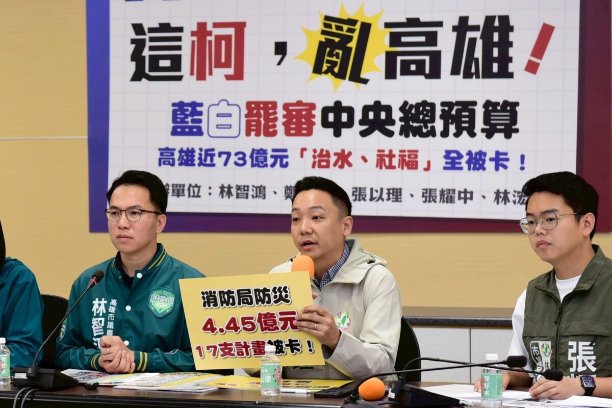 【記者 王苡蘋╱高雄 報導】針對藍白陣營罷審中央總預算,導致地方建設與多項民生計畫延宕,高雄市議員林智鴻、鄭孟洳,與高雄市議員參選人張以理、張耀中、林浤澤,今(19)日聯合召開記者會,首度公布「高雄受害清單」。五人指出,中央總預算遭退回至今已長達144天、累計7度卡關,造成高雄市18個局處、近新台幣73億元中央補助及新興計畫無法動支,涵蓋治水、社福、交通、防災、農業與原民政策等多項攸關市民安全與福祉的重要建設。