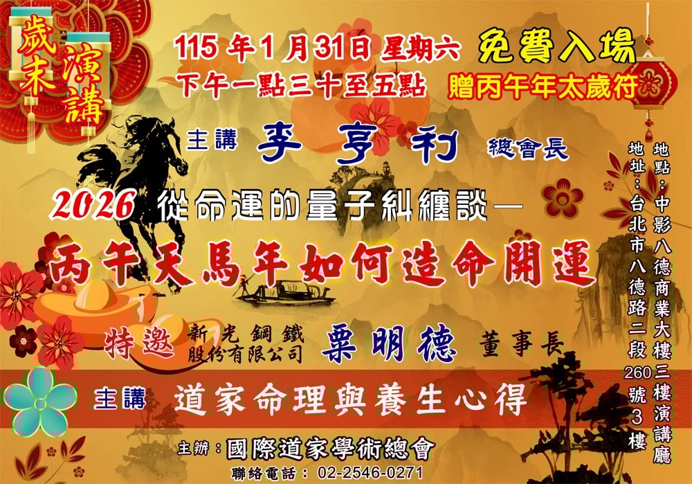 【記者 郭夢迪/台北 報導】2025年歲末,各界歡欣迎春,由國際道家學術總會舉辦的丙午年新春演講-「從命運的量子糾纏談—丙午天馬年如何造命開運」,將於1月31日下午1時30分,假中影八德商業大樓3樓演講廳舉辦。