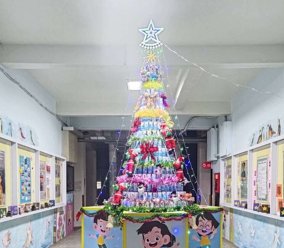 其中校園中最受矚目的「大型牛奶瓶聖誕樹」,是由全校學生蒐集每日飲用後的空牛奶瓶,經清洗整理後再進行堆疊組裝而成,並結合前年「80周年校慶運動會」的裝飾素材再利用,將校園歷史記憶轉化為節慶景觀,象徵資源循環與校史傳承的延續。