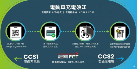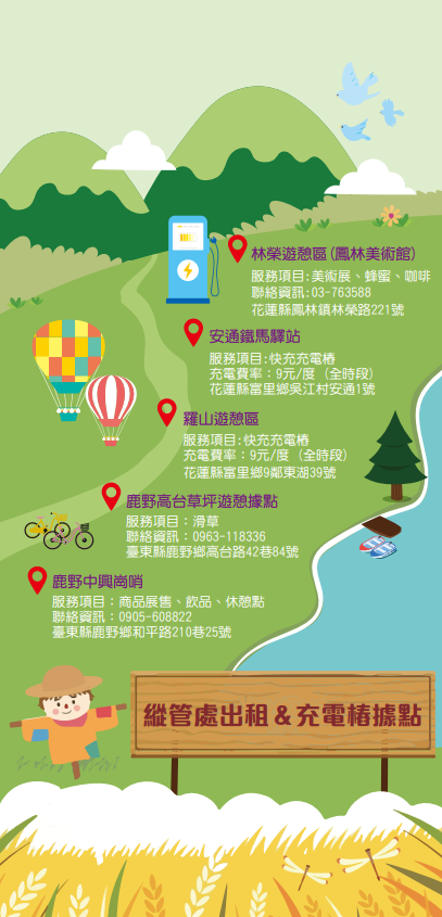 花蓮縣南區的玉里鎮與富里鄉一帶,缺乏高效能的電動車充電站,導致電動車遊客在規劃長途縱谷行程時,往往面臨路徑選擇的限制,因此縱管處選定具備歷史文化意義的「安通鐵馬驛站」以及具備農遊樞紐地位的「羅山遊客中心」,建置高規格的240kW快充電動汽車充電樁(CCS1、CCS2),並於115年1月7日起以全時段9元/度的收費標準,正式對外開放使用,對於行駛於台9線的遊客而言,能夠在15至20分鐘內補充200公里續航力,將大幅地提升了遊客的旅遊規劃彈性,掃除里程焦慮,暢遊花東縱谷。