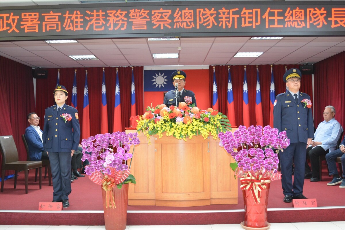 【記者 王苡蘋╱高雄 報導】內政部警政署高雄港務警察總隊今(20)日上午11時於總隊禮堂舉行新卸任總隊長交接典禮,由警政署副署長李文章親自主持監交。原任總隊長朱信憲奉調警政署行政組組長,由副總隊長楊肇萍代理卸任,並將印信正式交予新任總隊長廖國政,儀式簡單隆重,象徵港區治安任務順利傳承。
