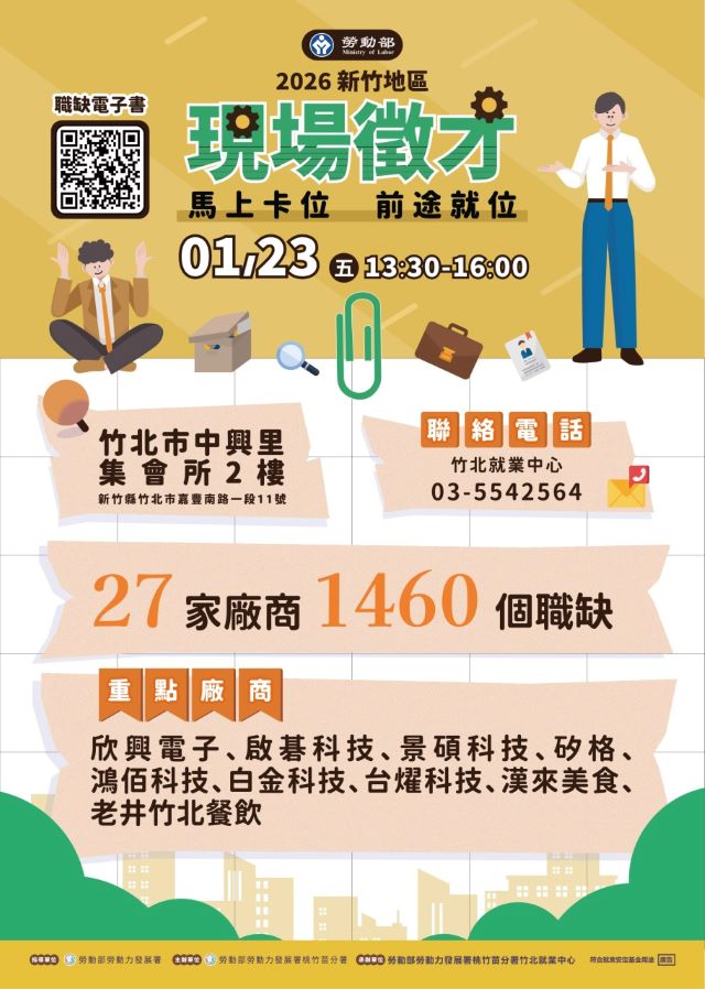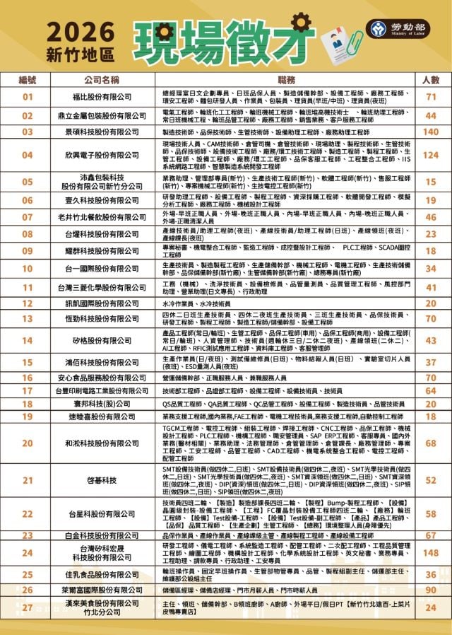 【記者 彭慧婉/新竹 報導】為協助待業與轉職民眾在農曆年前找個好工作及年後轉職搶先佈局,勞動部勞動力發展署桃竹苗分署於1月23日下午1點30分至4點,在竹北市中興里集會所二樓 (新竹縣竹北市嘉豐南路一段11號)舉辦「2026年新竹地區現場徵才活動」,邀請科技業、製造業、零售業、餐飲服務業等共計27家知名廠商,提供高達1,490個優質職缺,不少企業招募主管及儲備幹部人才,歡迎有求職、轉職或是想在年前尋找全新職涯機遇的朋友踴躍參加。