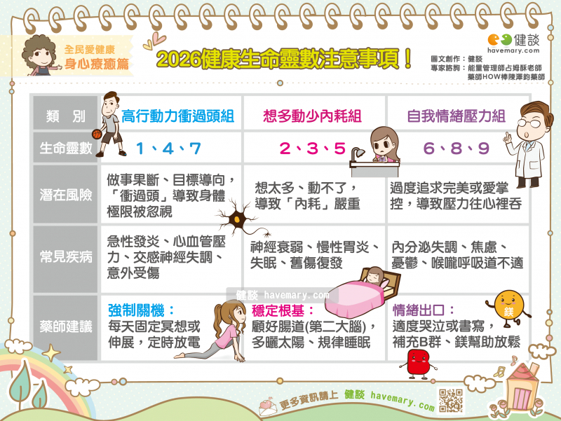 針對1、4、7號人這組高行動力的族群,占姆酥老師分析指出,由於2026年流年數字1的能量講求果斷與行動,這類本身特質強烈的人容易出現「衝過頭」的狀況,進而引發健康危機。其中,1號人常因長時間投入工作,容易導致脊椎與肩頸出現病變;目標導向強烈的4號人,則易因高壓工作造成消化不良、免疫力下降,甚至會有拖著疲憊或老化的身體硬拼的狀況;而7號人精神常處於高壓狀態,初期會有筋絡緊繃的現象,長期下來恐導致失眠、精神恍惚與易怒。對此,陳澤鈞藥師特別補充示警,這類高行動族群在生理上最容易面臨急性發炎、交感神經失調、心血管壓力與意外受傷等風險,因此強烈建議每天必須強制自己「定時放電」,透過冥想或伸展來強迫身體休息,才能避免身體這台車在高速行駛下失控。