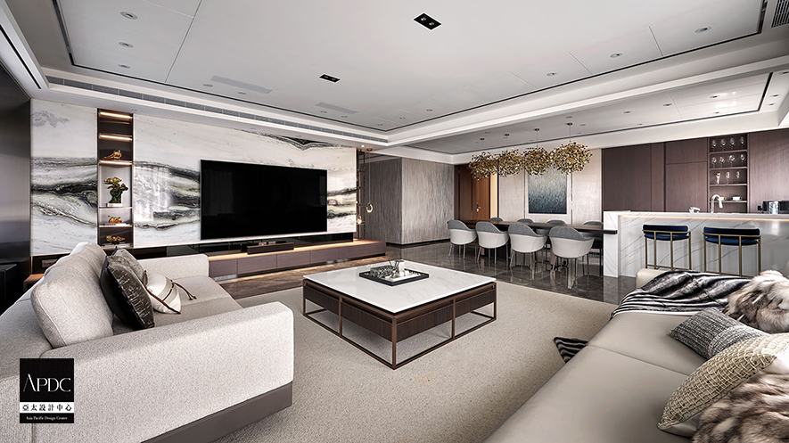 ▲客廳牆面以淺色為主,佐搭大面積落地窗,打造開闊明亮空間感,電視牆深色陳列櫃前垂墜半弧月形吊燈,圓潤線條與整體風格相協調,中央擺放深色底部、白色桌面茶几,周圍環繞灰白雙色沙發,色調平衡,體現設計的一致性。