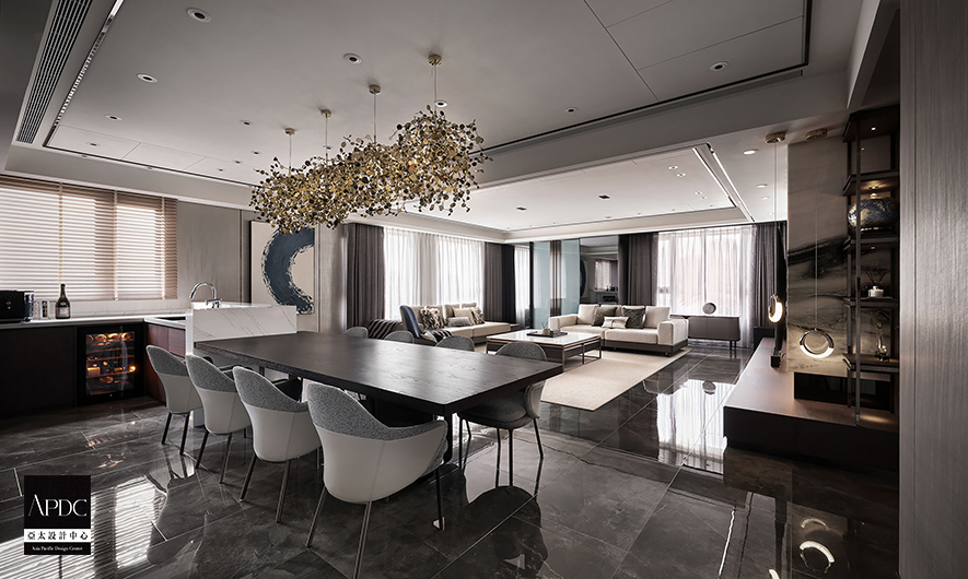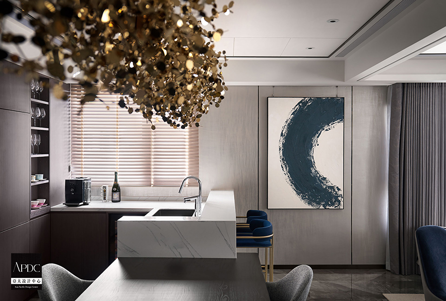 ▲餐廚區餐桌連結白色石紋吧台,提供輕食準備兼休閒的理想場所。一幅藍灰漸層的抽象畫作與另一側的圓弧水墨畫,為該區注入藝術氣息,同時再次呼應上空四顆吊燈,強調「圓滿」之意。