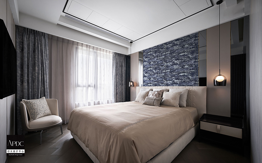 ▲主臥以灰白色為基底,營造寧靜沉穩之感,床頭背牆選用深淺交織抽象壁紙,與同色系磁吸絲絨窗簾形成和諧對話,兩者在材質視覺效果上相得益彰,為臥室增添層次分明藝術感。