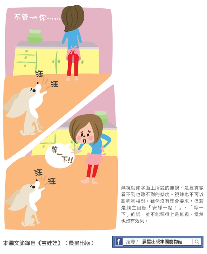 會對著飼主吠叫,大多屬於「跟我玩」、「去散步吧」等有所要求的吠叫。因此要從遊戲、散步、吃飯都還不會吠叫的時候開始,告訴狗狗如果不叫的話就會有好事發生。若已經開始吠叫了,就先視而不見,等停止吠叫時再理會狗狗。若一直持續吠叫10分鐘、20分鐘的話,就要堅持努力裝作沒聽到。很多飼主第一次會視而不見、但第二次就會心軟了。可是那正是強化狗狗要求性吠叫的行為。徹底地狠下心來視而不見很重要。