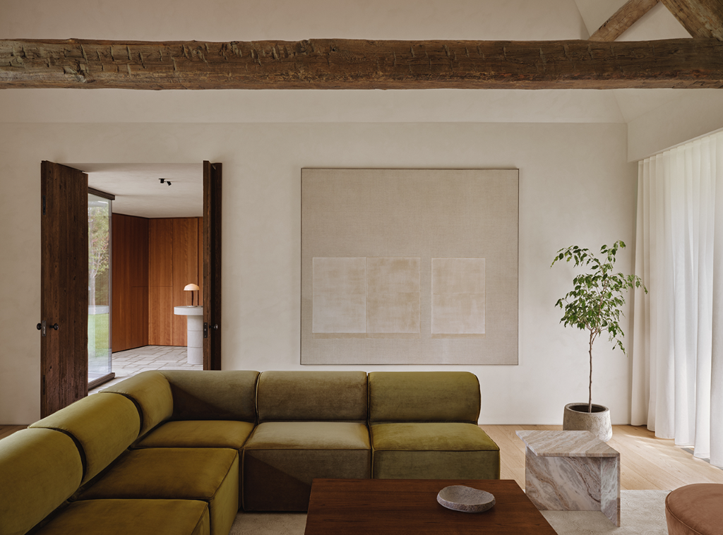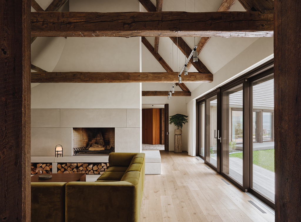 室內以地面層為主軸,布局開放通透,設計師透過水平鋪陳的手法強調流動感。各場域之間以大型回收木門作為區隔,既保有各自獨立隱私,又不損害整體連續性。多數空間採挑高配置,配合教堂式斜屋頂與裸露橫梁,使光影變化更具層次,也進一步勾勒居家靜謐感與大氣特質。
