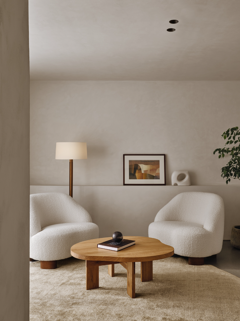 材質選擇方面,室內使用石材地坪,強化空間的溫潤厚實感,同時結合地熱系統,使居住品質更為穩定與節能。牆面與天花大量使用天然木料與無毒塗料,並搭配低揮發性家具,使整體空氣品質清新自然,展現一種真正回歸天然本質的永續理念。