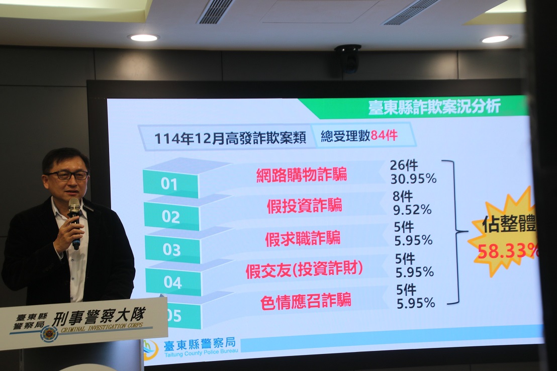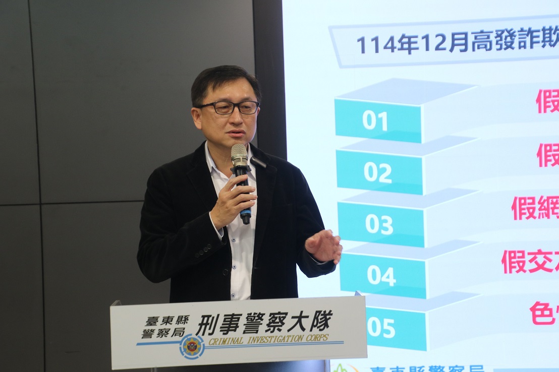警察局林宏昇局長指出,根據內政部警政署165打詐儀錶板顯示,臺東縣於114年12月間共發生84件詐欺案件,總財損為新臺幣1,928.2萬元,前5大高發手法中依序為「網路購物」、「假投資」、「假求職」、「假交友(投資詐財)」及「色情應召詐騙」手法,提醒民眾留意假網路購物詐騙,並解析收到「詐騙包裹」的處理管道;另近期透過色情應召手法詐財案件增加,以誘導民眾購買點數、提供序號等手段取得不法利益,警察局期盼藉此機會與超商聯手宣導,提高大眾識詐知能。