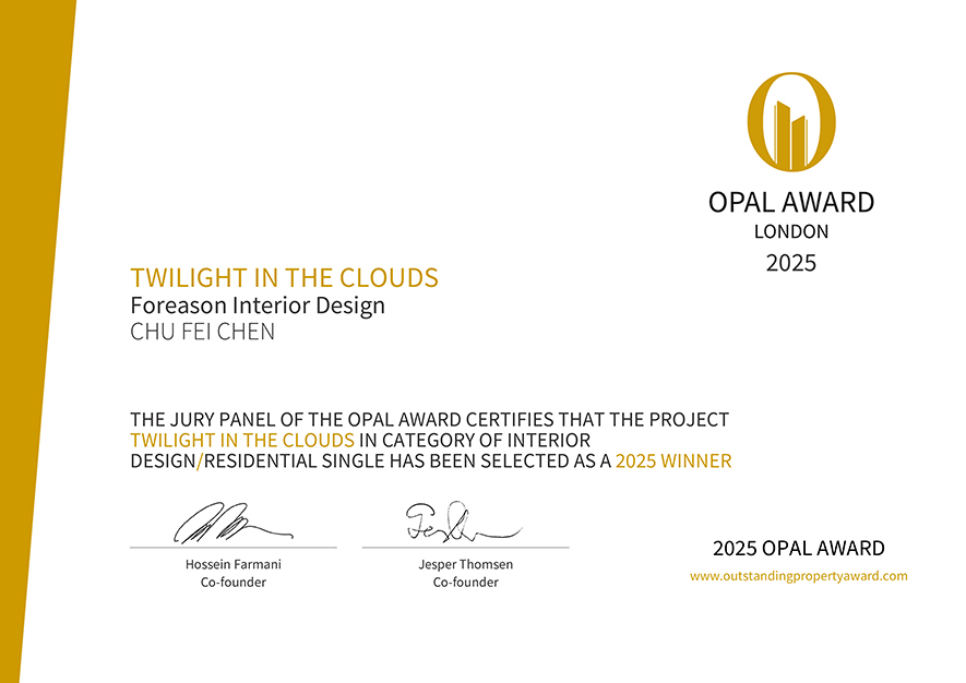 OUTSTANDING PROPERTY AWARD LONDON,OPAL(英國倫敦傑出地產大獎)由全球知名企業集團Farmani Group組織,並以招攬全球最佳建築師、室內設計師與房地產開發商為目標,在創造異業菁英聯合平臺的同時,找尋各地最富創造力、革新感、社會影響力與永續性的設計方案。擎森設計 設計總監 陳楚扉