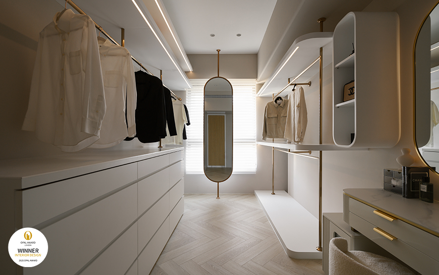 ▲主臥弧形木作床背板內藏暖黃間接光源,可作夜燈並營造舒眠氛圍;更衣室整合衣架、抽屜櫃與梳妝臺,並以伸展臺為概念發想窗畔淺金鏡面,提供住者一展美學的時髦舞臺。