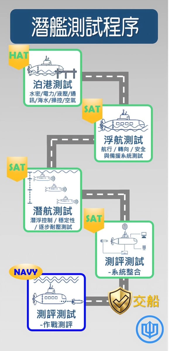 台船公司指出,潛艦在正式服役前,必須歷經嚴謹而系統化的測試程序,確保艦體結構、動力系統、航行操控、通訊與作戰系統等各項功能均符合安全與性能標準。相關測試依序涵蓋岸測、泊港測試及海上測試等階段,每一項測試皆須反覆驗證、逐步確認,才能進入下一階段,充分展現潛艦工程對安全與可靠性的高度要求。