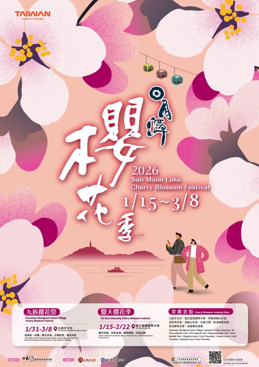 【記者 周澄予/南投 報導】粉紅花海正式報到!全台旅人引頸期盼的「2026日月潭櫻花季」浪漫登場,日月潭山湖之間化身春日限定舞台。九族文化村與國立暨南國際大學攜手在地產業,以逾五千株櫻花串聯園區、校園與秘境步道,搭配限定遊程、優惠好康與搭好行抽好禮,邀請國內外遊客走進日月潭,在櫻花盛開的季節裡,放慢腳步、感受最動人的浪漫春色。