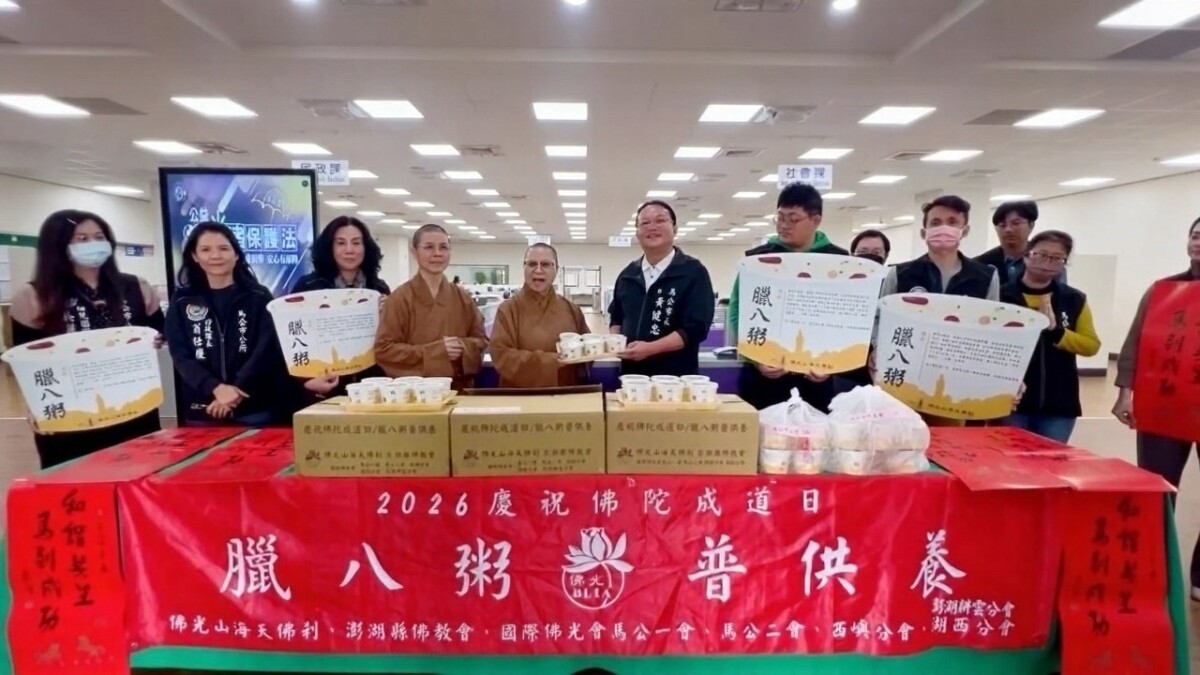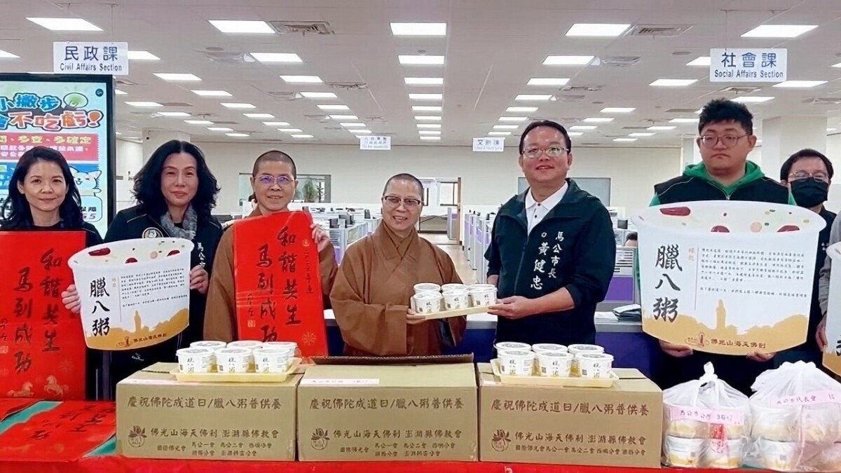 【記者 葉佳盈/澎湖 報導】延續臘八節結緣送暖的傳統,佛光山海天佛剎23日走入馬公市公所,致贈230碗臘八粥與市政團隊分享,並轉贈星雲大師墨寶春聯,為繁忙的行政現場注入節氣中的溫暖與祝福。活動由滿舟住持率同永昭法師、妙念法師親臨市公所,與同仁結緣交流。
