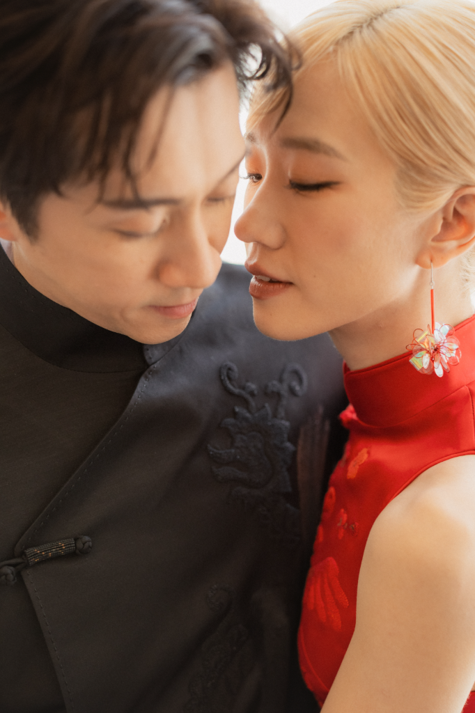 新娘 Lulu 身著一襲 夏姿紅中式立領削肩背心,搭配蕾絲絲緞拼接魚尾拖曳長裙,以兩件式設計勾勒嬌小身形比例。削肩線條與中式立領相互呼應,展現俐落與柔美並存的女性風貌。經典的夏姿紅也在 Lulu 身上顯得格外清雅動人,為年輕世代演繹當代視角下的東方優雅。禮服以「鳳」為題,寓意著柔韌與祥瑞,與新郎禮服上的「龍」意象相互呼應,寄託對新人圓滿、和合的祝福。