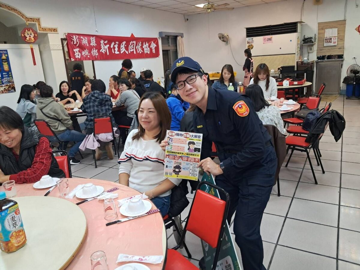 【記者 葉佳盈/澎湖 報導】年關將近,西嶼鄉新住民關懷協會辦理「年終尾牙餐會」活動,白沙分局外垵派出所亦前往加強交通安全及防詐騙宣導,營造優質的生活環境,讓民眾過一個快樂的平安年。