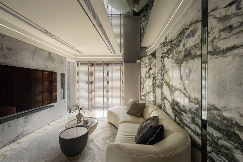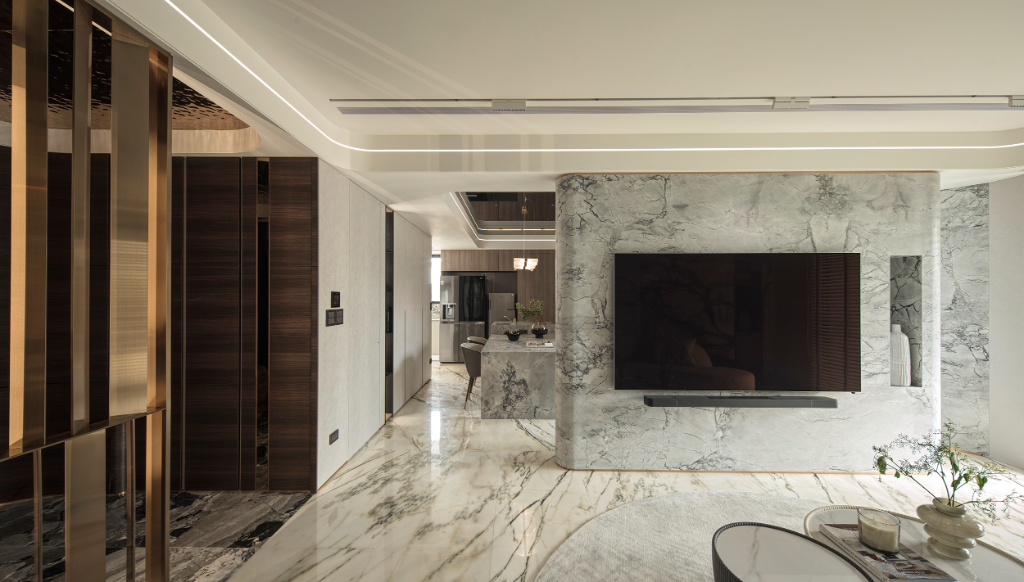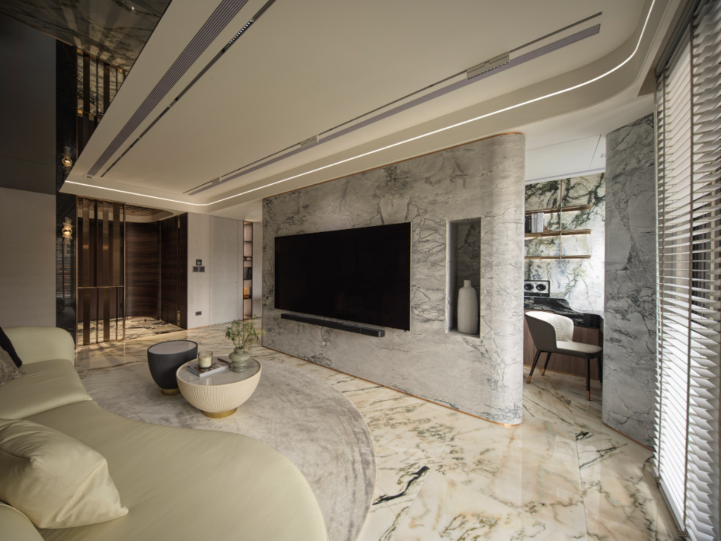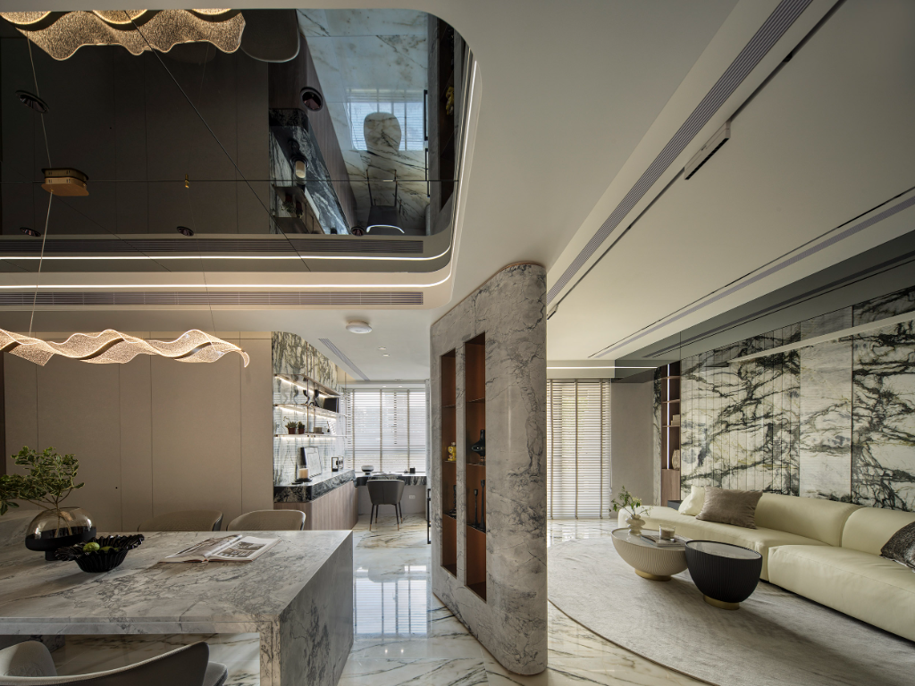 進入客廳,視覺焦點立即被氣勢渾然的潑墨山水大理石主牆所吸引。石材紋理宛如山水畫般向左右延伸,左側弧形面加工切割三角溝縫刻劃出細緻線條,讓石材視覺得以延伸至前陽台,側邊同時規劃燈光展示櫃,下方結合掃地機器人收納設計,以低干擾的語彙融入整體風格。此外,公區地坪採用黃金雕刻白大理石,搭配客廳天花以圓角框線搭配局部灰鏡包覆,使光線反射放大垂直尺度,同時消解結構大梁的沉重,讓視覺延伸。
