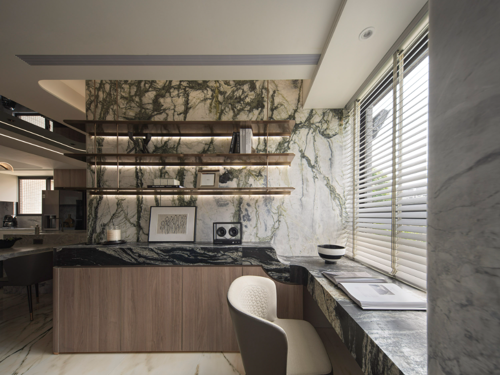 屋主希望擁有一處能閱讀、品酒、展示收藏並兼具工作用途的開放場域,因此設計團隊於電視隔牆後方與女兒房之間規劃「多功能開放空間」,並以環形動線串聯客廳與餐廳,使此區成為社交時刻的自然延伸。展示櫃背牆使用同樣使用潑墨山水大理石鋪陳,桌面及工作平台採用皮革面雕刻黑色紋理石材,一路延伸至書桌,並以弧線降版方式處理檯桌面連結處,讓線條更加柔順流暢。