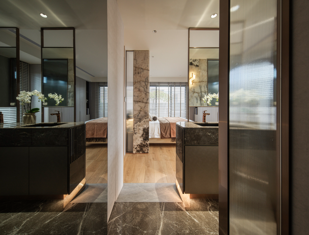 主臥回到更私人、更溫柔的語彙。舒眠區地坪以特殊拼接木地板鋪陳,每片需經現場預排確保紋理節奏一致,展現工藝細膩度。入門處以結合天使之星大理石與霧面線條玻璃的側屏風形成「半穿透」儀式性切換。