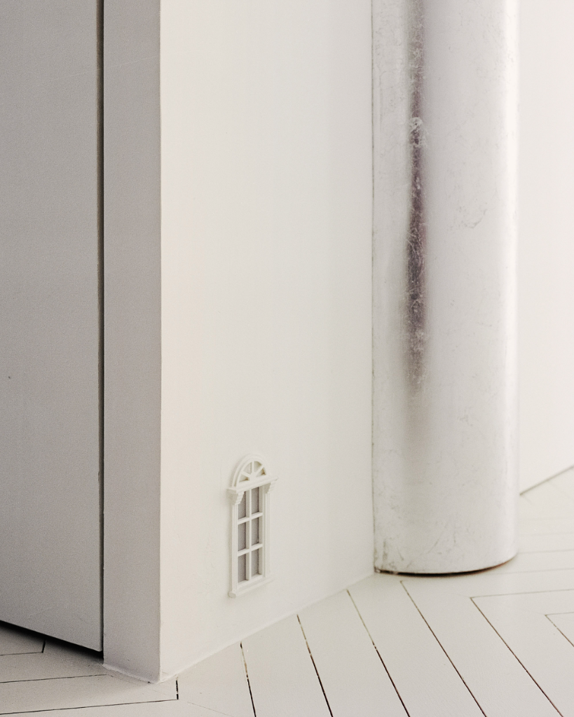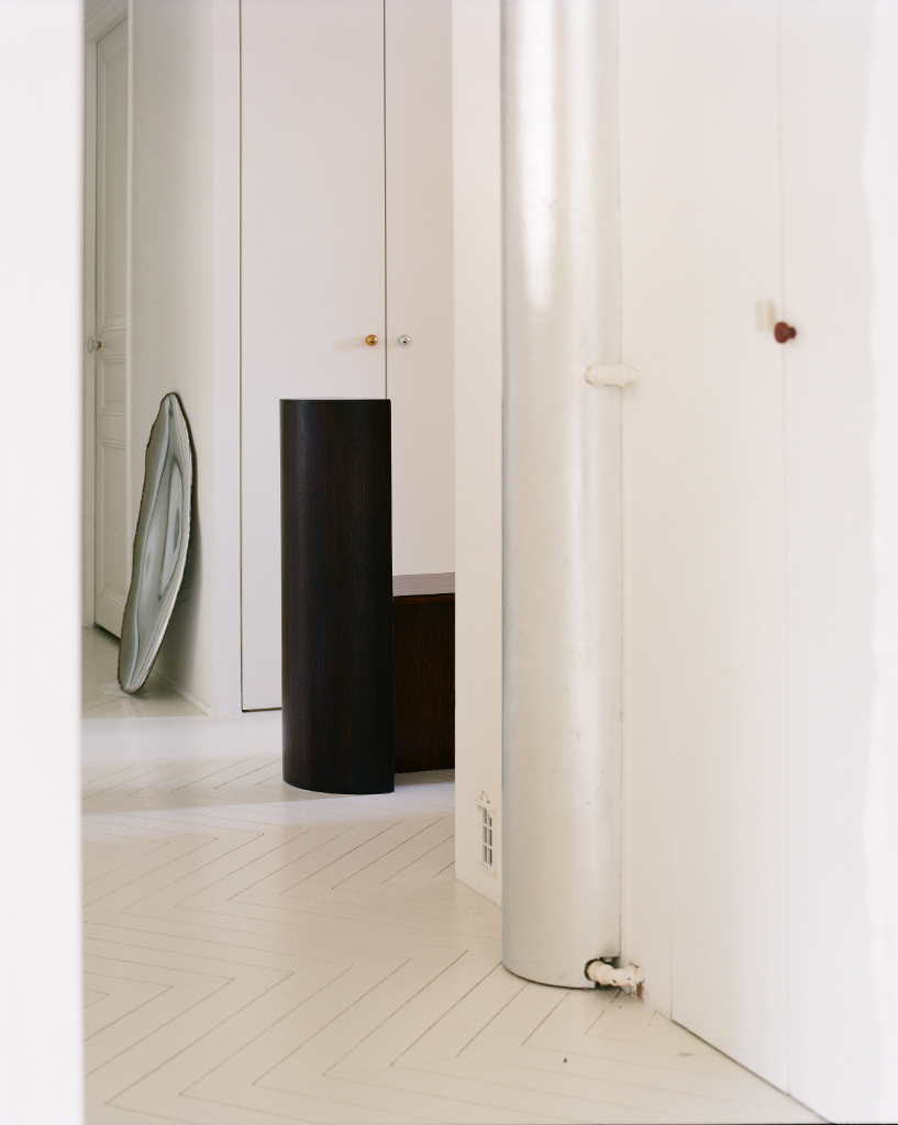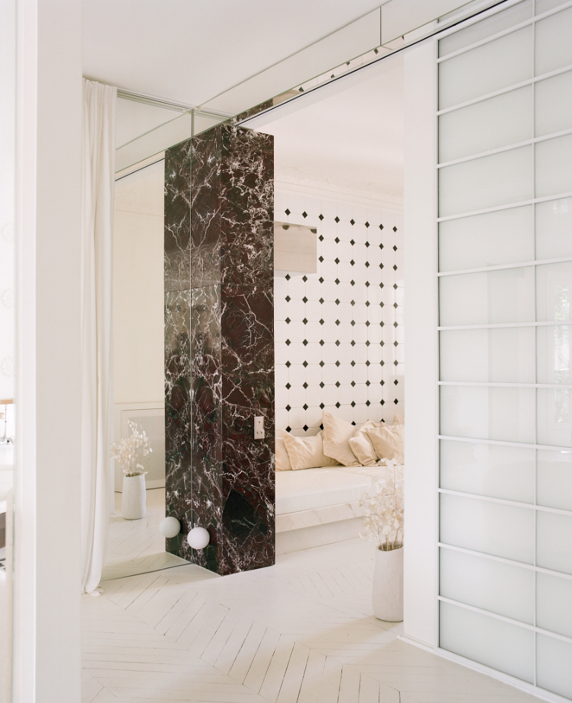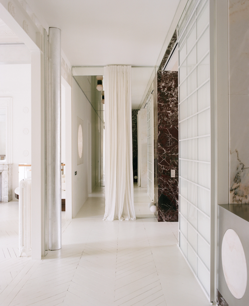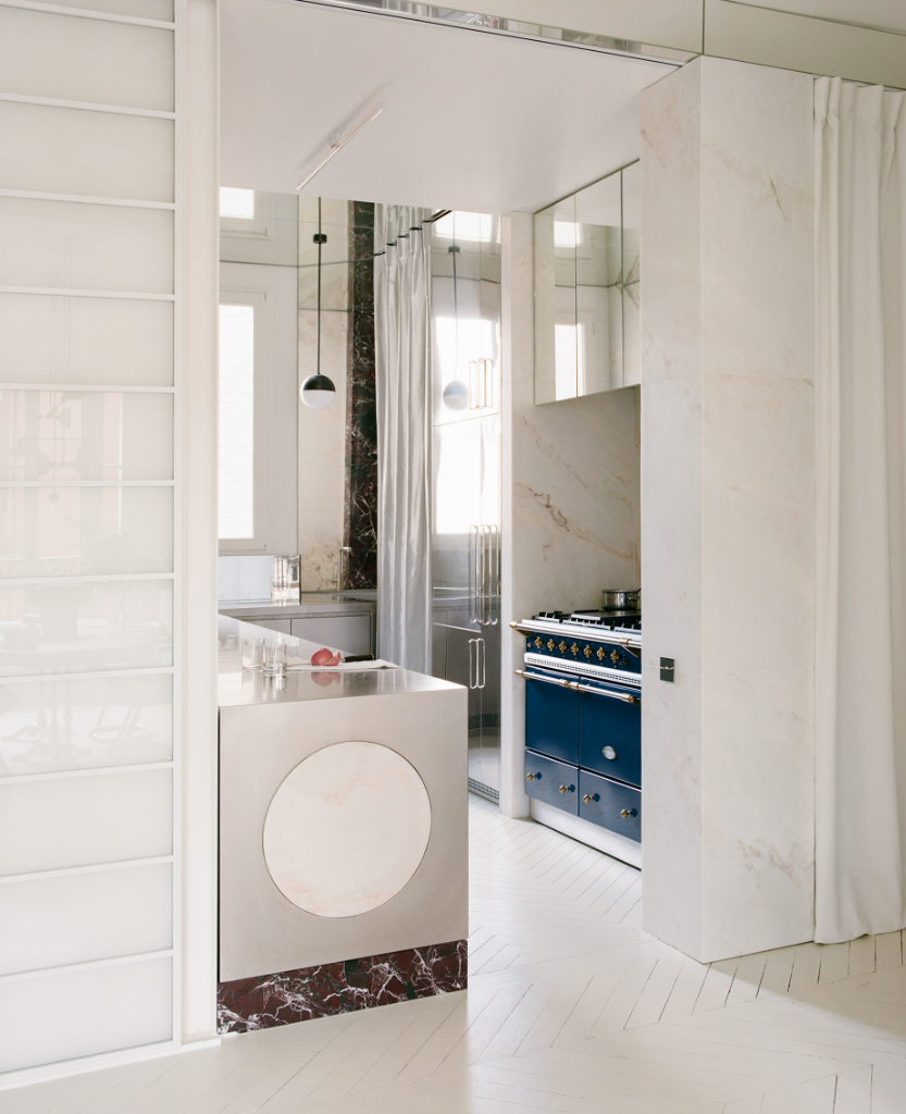 Lesnoff-Rocard巧妙地揭示建築結構的物質性,透過出乎意料又極具存在感的介入,讓優雅與功能性在其中並存。牆體結構上的開口改造,為整體帶來更流暢的動線與明亮的光感。材質與幾何線條相互對話,在白色基調的襯托下形成張力。外牆裸露的石材、混凝土墻上的圓形開口、鋼梁、大理石、鏡面與窗簾、不鏽鋼廚房中的鑄鐵爐灶——這些元素表達出冷與暖、精緻與粗獷、平滑與粗糙的並置感,成就了這個空間的敘事力量。