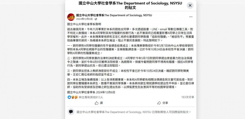 2024年12月6日,國立中山大學社會系的一則聲明讓整件事情浮出水面,文中寫道,畢業於本系的劉姓女同學,對不特定人散播本系A同學對其有性騷擾的加害行為,並且本系陳美華老師和王宏仁老師也屢遭劉同學散播「協助性騷擾」、「被送性平」等嚴重扭曲事實的資訊。