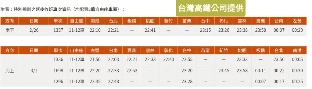 為加強服務旅客,和平紀念日疏運期間特別規劃4班延後收班列車(南下1班、北上3班),最晚至凌晨0時30分抵達端點站,歡迎多加利用;敬請搭乘延後收班車次旅客,預先留意/安排到站之交通接駁,以確保行程順暢。(詳附表)
