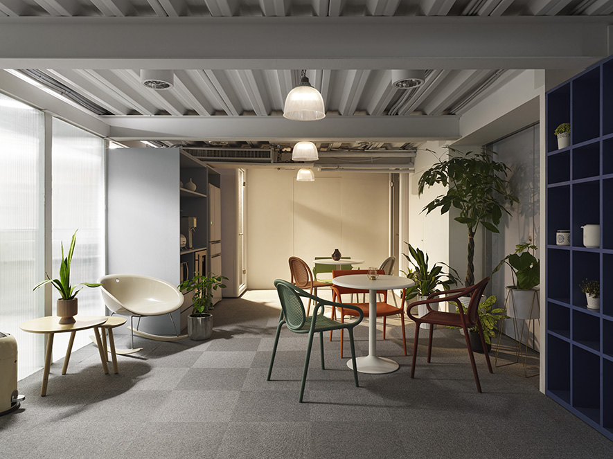 穿越理性的辦公區域,茶水間以意想不到的鮮明色彩迎接來者,進口座椅的紅綠跳色綻放勃勃生機,為日常工作間注入一抹燦爛朝氣;藍色收納櫃與企業識別色呼應,在強化品牌印記的同時平衡該區的色彩張力,整體在灰白背景的襯托下,實現活潑而不突兀的視覺效果,為休憩時光營造輕鬆愉悅氛圍。