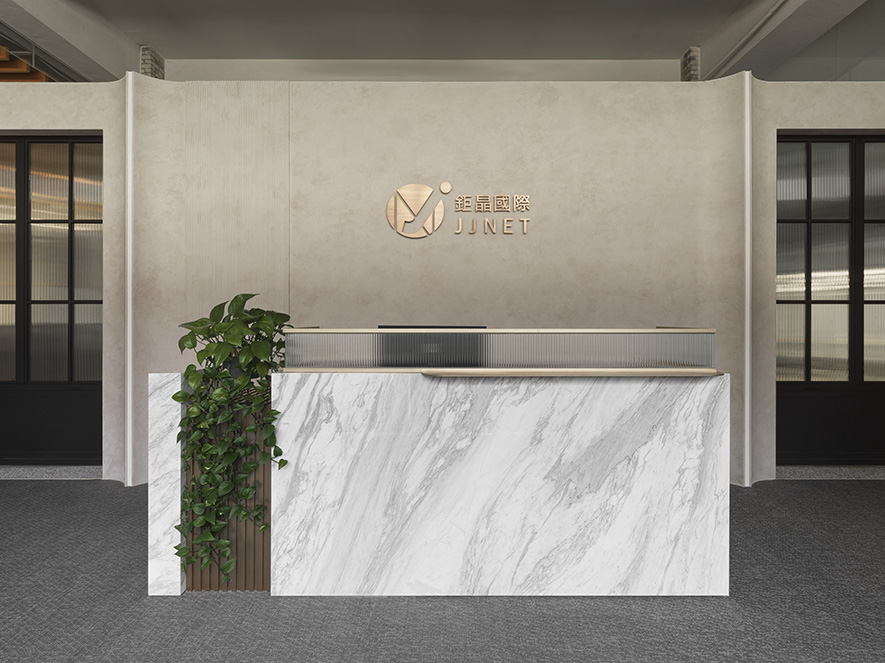 跨越英式黑色線條感的雅緻門扉,特選石材打造的接待櫃臺沉穩矗立眼前,原石的自然紋理透過冰柱玻璃門的柔光映照,呈現細膩層次變化,展現空間質樸底蘊;旁側綠植恣意分佈,與弧形背牆的柔和曲線溫柔包覆迎賓區域,共同傳遞開放、包容的企業精神。