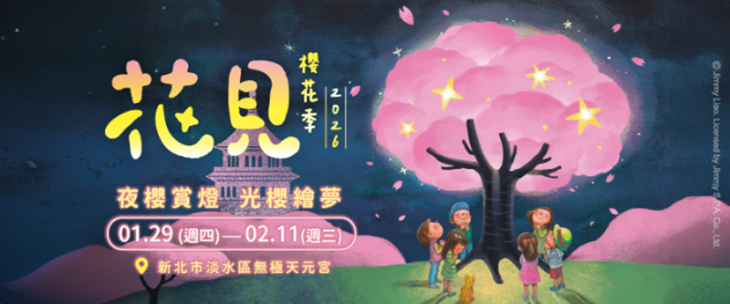 【民眾新聞方笙楠/臺北報導】2026花見櫻花季將於1月29日至2月11日在淡水區北新路無極天元宮展出!今年除了可欣賞盛開的三色櫻外,還新增了由淡水學堂策劃的「櫻花慢旅」走讀、與在地商家合作,提供阿給及各式手作活動折價優惠,以及結合藝術家幾米所創作的《閉上眼睛一下下》之繪本世界,打造互動場景等活動,美景搭配燈光,濃濃的粉色櫻花風格,預計可吸引大量遊客前來觀賞。