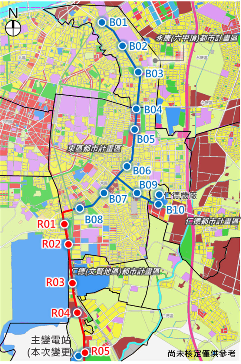 局長王銘德指出,因捷運列車牽引、車站設備都需要電力,本次座談會所討論的用地係規劃為主變電站,該用地(二仁段1084地號土地)位於仁德(文賢地區)都市計畫區內農業區,靠近機場圍牆邊,現為蔗田及瓜田,現規劃變更為捷運系統用地並修正土地管制要點,該地點位置適中,未來設置主變電站可供應藍線所有車站、列車及其他設施所需轉供電力,也可兼顧未來捷運紅線之供電需求。