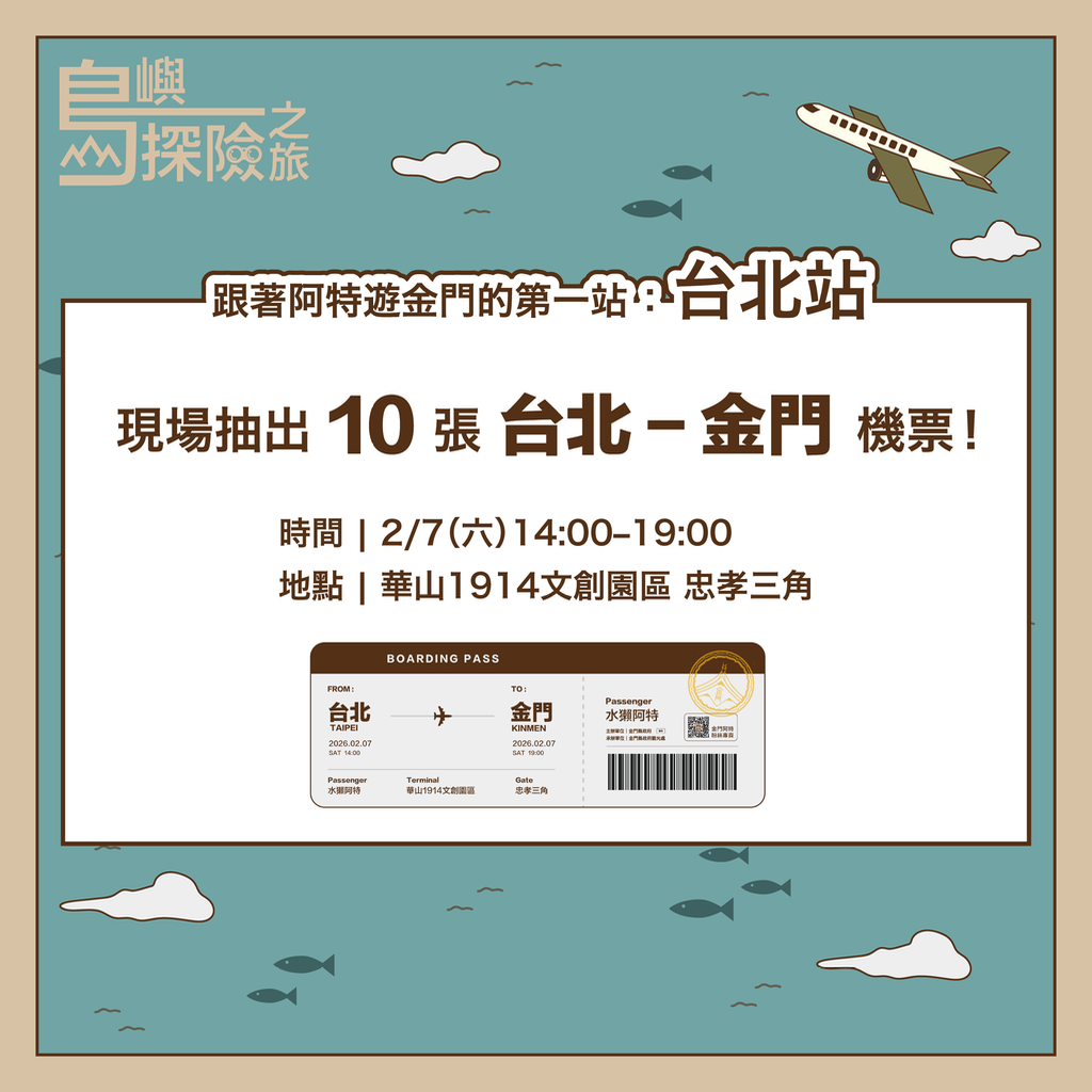 金門縣政府觀光處表示,台北站是「跟著阿特遊金門」系列活動的起點,後續將持續串聯金門五鄉鎮,推出相關展出與活動,邀請民眾跟著阿特走進金門,展開一段結合藝術、文化與旅遊的島嶼探索旅程。
