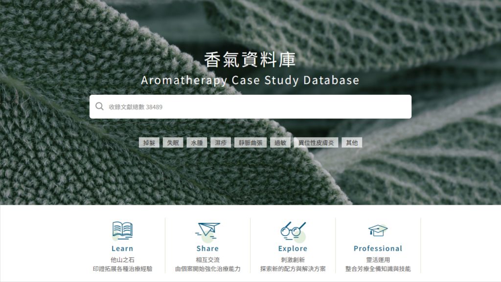 這套被譽為「芳療界的 Google」香氣資料庫,最大特色在於其強大的檢索功能。系統彙整大量芳療應用案例、精油與植物油的基礎資料,並整理芳療師分享的實務經驗作為參考;對於一般民眾而言,最實用的莫過於全新的「症狀資料庫」功能。資料庫匯整了近百種的常見症狀,民眾可依照自身感受或使用情境,一鍵查詢相關芳療經驗分享與應用方向,作為氣味選擇與日常放鬆的參考。