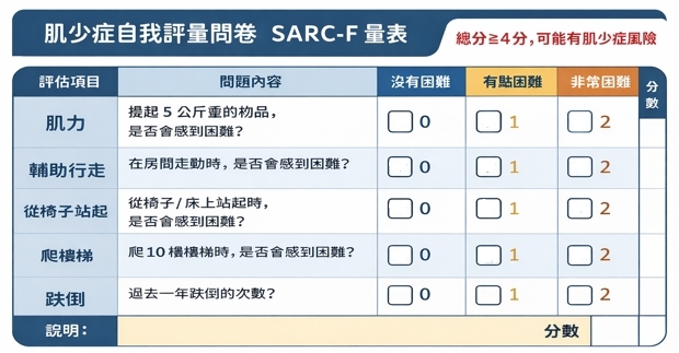 陳佑昀治療師帶領長輩進行簡單自我檢測,不需昂貴設備即可初步了解肌少症風險。他介紹國際常用的「SARC-F問卷」,透過手部握力、從椅子站起是否費力、走路是否容易疲倦、外出時是否感到不穩,以及近期是否跌倒等五項日常功能檢視,加總分數即可判斷肌力與行動能力是否下降。接著示範「小腿圍量測法」,長輩坐椅子、雙膝90度彎曲,小腿自然放鬆垂下,以皮尺量取最粗處,男性低於34公分、女性低於33公分,表示肌肉量可能不足,需要透過飲食與運動加強。小腿被譽為「第二顆心臟」,其肌肉量能反映下肢整體力量,簡單測量就能掌握身體是否正在變弱,及早採取行動。