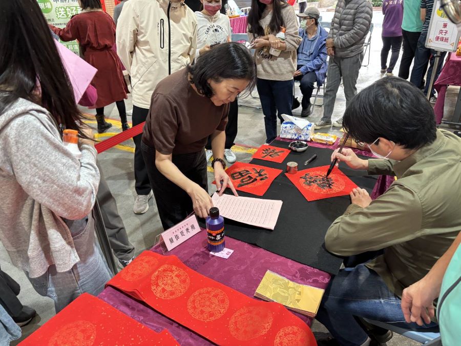 本次活動特別邀請書法家王苡蘋、簡佑臣、簡順能及林端姮等4位書法名家親臨現場,依民眾需求即席揮毫,將一句句吉祥祝福化為獨一無二的春聯作品。許多民眾攜家帶眷前來排隊索取,現場不僅是文化藝術的交流平台,更成為鄰里情感連結的重要場域。