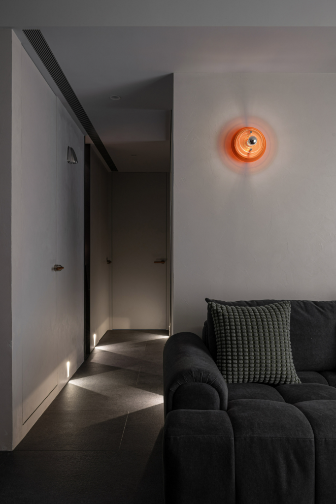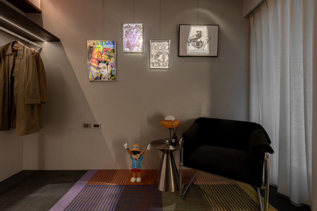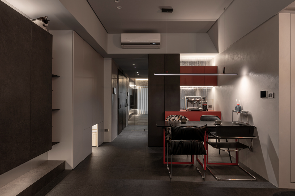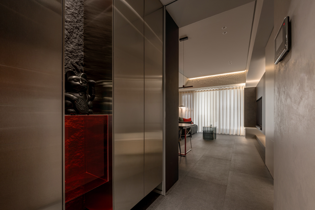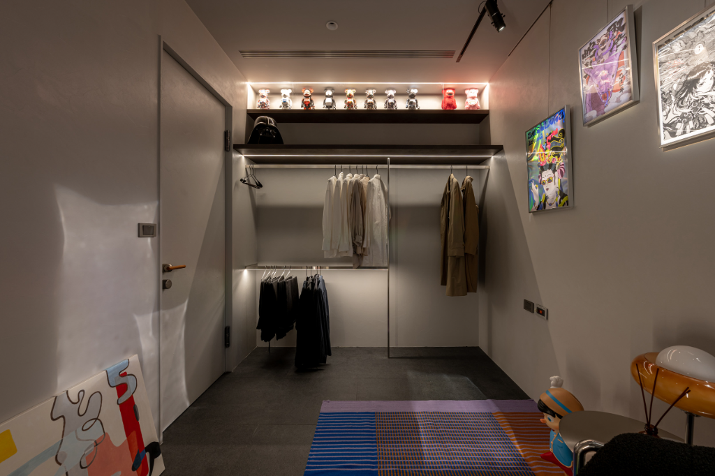 走入玄關,一場關於「視覺反差」的敘事便悄然展開。懸空的壓克力展示櫃,經由上方保持3度角的嵌燈照射,在仿石皮凹牆上形成一束精準光錐;橘色壓克力燈座則增添一抹熱度,為整體冷峻氛圍定下暖色基調。裝設於牆櫃之間的貓跳台,採鐵件拼接與留白設計,既是寵物的行走動線,也是展示屋主獨特思維的一角,彰顯與喵星人共居的溫馨氣息。同步啟動的地燈與壁龕同步點亮,巧妙製造儀式感,一入門即感受到將有精彩故事上演。