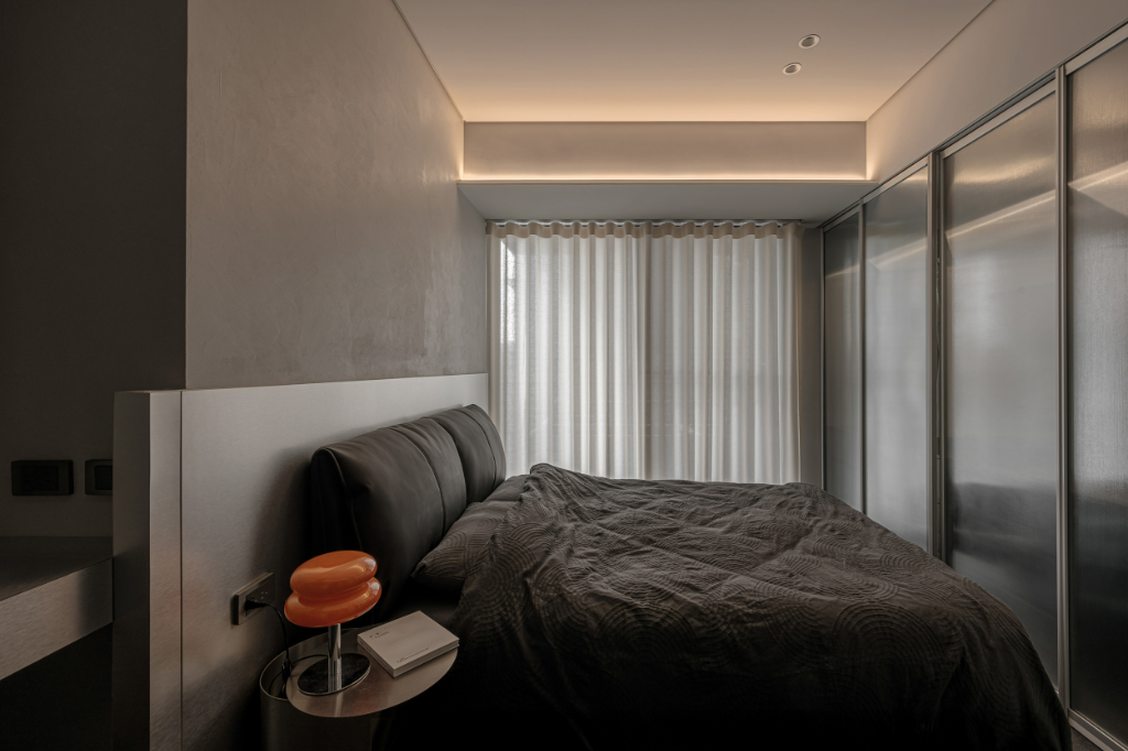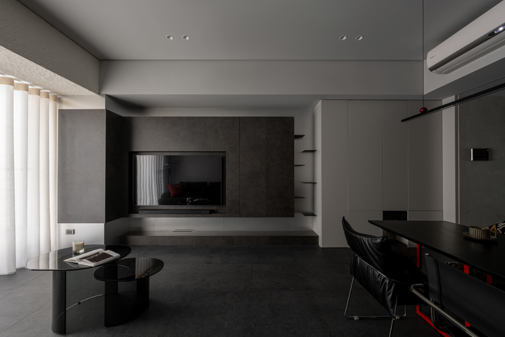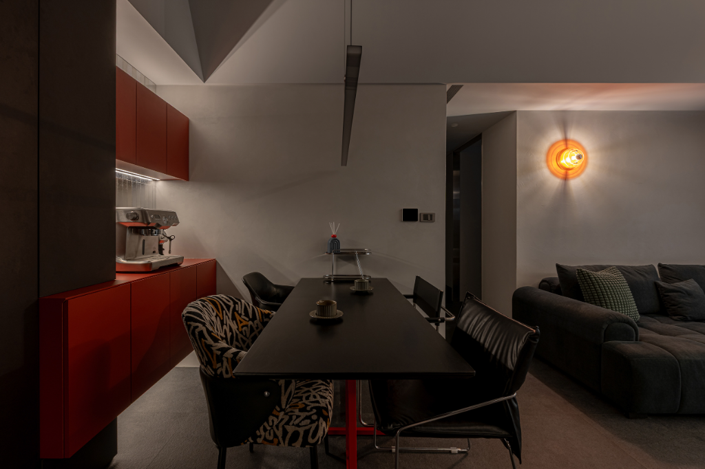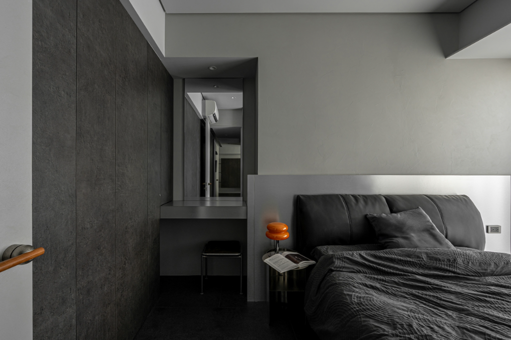 空間中最具張力之處,無疑是橫亙客廳上方的巨大橫梁。設計師未試圖遮掩,反以仿石材鑿面修飾,與金屬凹面電視牆形成異材質對話,使令原本的結構壓力反轉為居家重心。室內整體色彩則選用黑、銀、橘紅為主軸,牆面施作特製礦物塗料,結合石英砂與乳膠漆的自製配方,創造滑順中帶有微紋理的灰階質地。輔以不鏽鋼、鐵件與石皮飾板,形塑出冷暖並存、極具層次的動感節奏。
